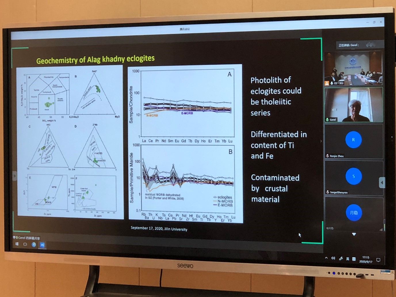 After that, Professor Yu Xiangjiang, Lecturer Li Wenbo, Professor Ochir Gerel, Professor Kevin Taylor and Researcher Ma Lin gave academic reports on their specific topics, which are “Isostatic effects of Cenozoic sediments in East Asia”, “A multi-faceted assessment of degradation threats to peri-urban cultivated lands and its protection zoning in the black soil region of northeast China”, “Magmatism and geodynamics of paleosubduction zones in Mongolia”, and “Multi-scale 3D and 4D imaging of sub-surface reservoirs, lessons learnt and future directions”. Later on, experts and scholars from both sides discussed frontier scientific issues, such as research problems, research methods and future developmental directions.