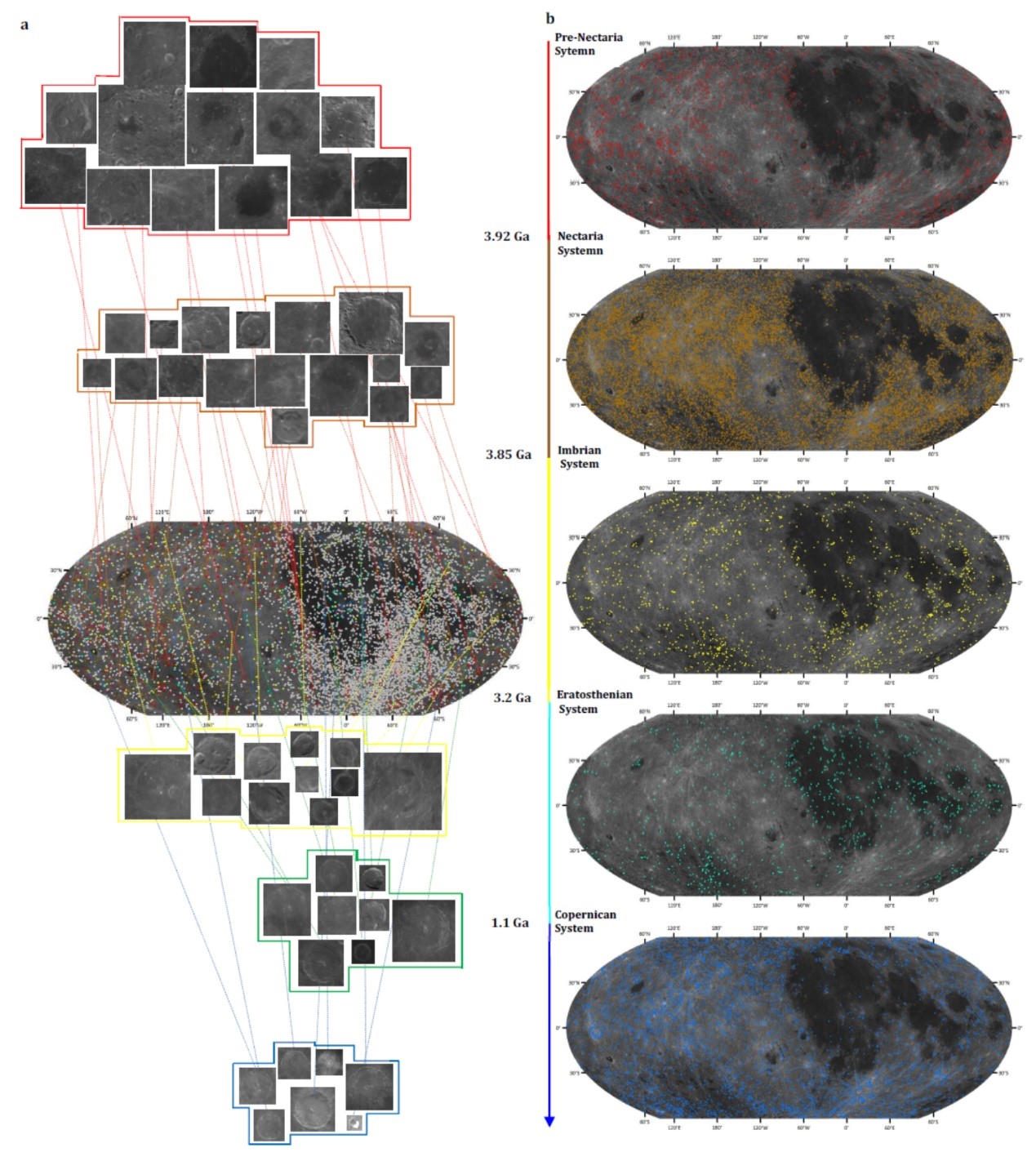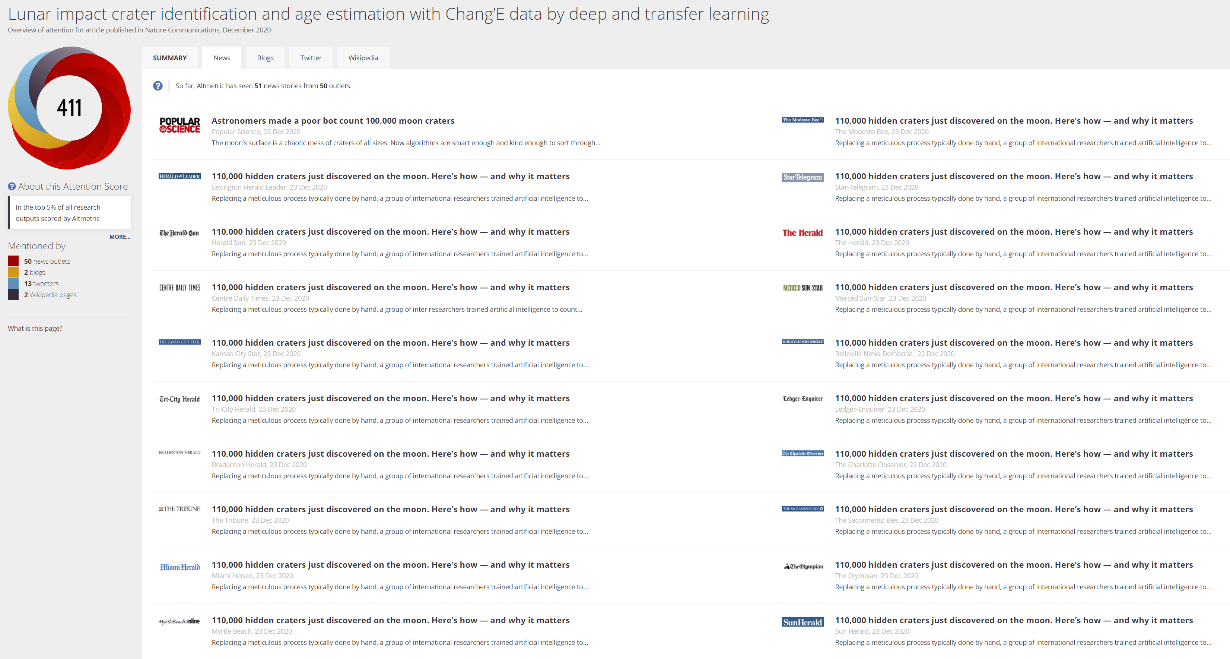 杨晨副教授等研究人员构建了基于迁移学习的深度神经网络模型,从嫦娥一号(Chang'e 1)与嫦娥二号(Chang'e-2)数据中渐进式的检测撞击坑并进一步估计出其地质年龄。109,956个新撞击坑被识别,数量为公认撞击坑的十几倍;18,996个(直径大于8km)的撞击坑被标定了地质年代。新撞击坑与人工识别撞击坑数据库一致性高达85.30%,大型撞击坑和小型撞击坑假阳性分别为4.49%±0.7%和4.67%±2.1%。从空间分布与对比现有撞击坑年代学方法证明了其年代标定的可靠性和一致性。这些识别和标定的撞击坑贯穿于月球中纬度和低纬度地区。基于深度迁移学习的撞击坑数据库与模型对于月球及行星科学研究具有重要价值,得到了国内外同行的认可和高度评价。