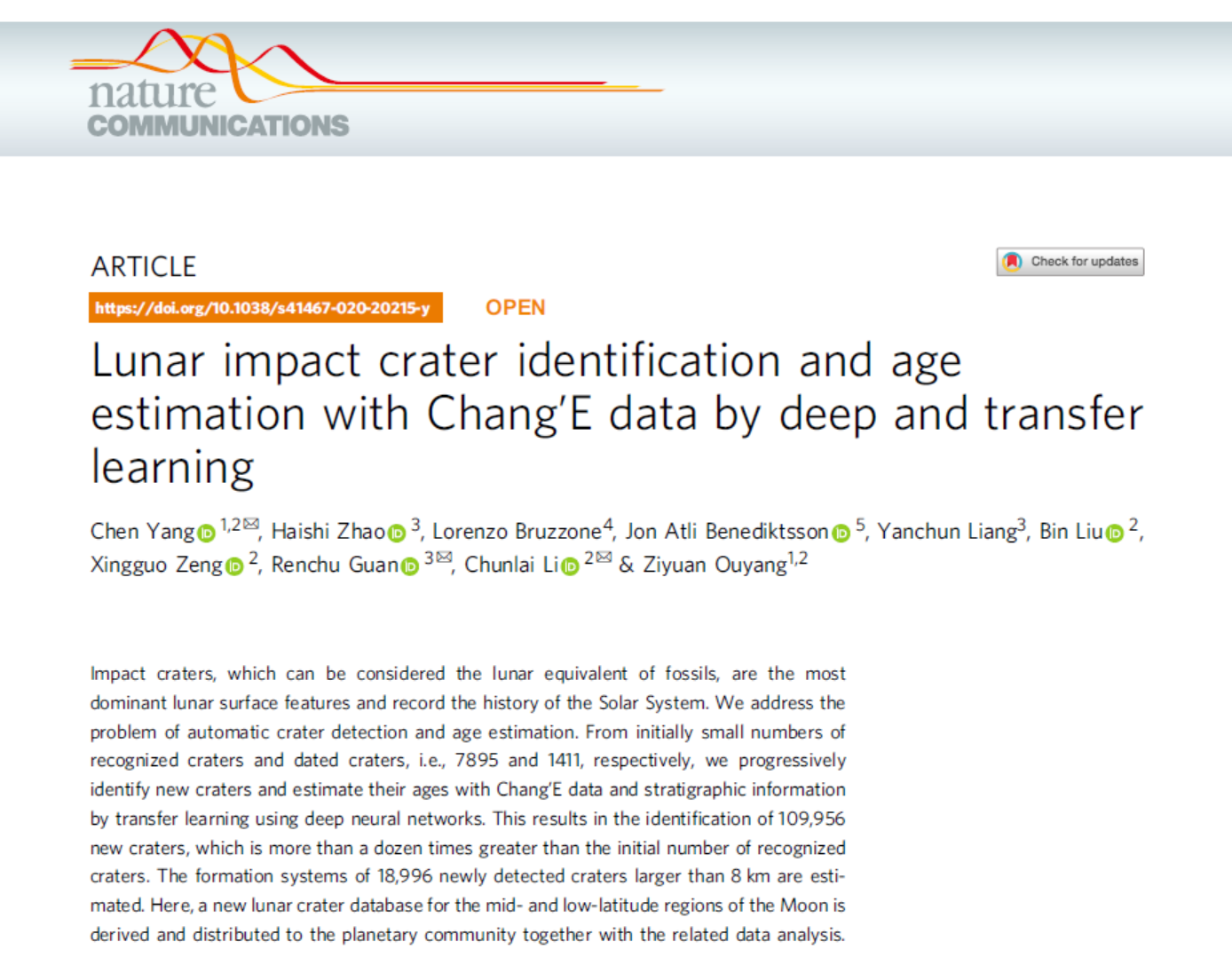 伟德体育伟德体育官方网站杨晨副教授联合伟德体育伟德体育官方网站计算机科学与技术公司管仁初教授研究组、中国科公司国家天文台月球与深空探测重点实验室欧阳自远院士团队,在月球撞击坑智能识别和年代标定方面取得突破性进展。研究成果以“Lunar impact craters identification and age estimation with Chang'E data by deep and transfer learning(DOI: 10.1038/s41467-020-20215-y)”为题,于2020年12月22日作为亮点文章发表于Nature子刊《Nature Communications》(文章链接:https://www.nature.com/articles/s41467-020-20215-y)。目前,研究成果被新华网、中国新闻网、NBC News、Popular Science、German Press Agency、Live Science、US News和CNN Digital等多家新闻媒体采访和报道。