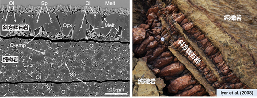 图1. 含水熔体-橄榄岩反应实验结果(左)与蛇绿岩(右)中的斜方辉石岩-纯橄榄序列