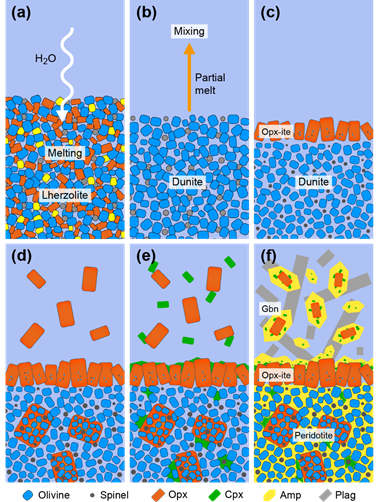 图2. 含水熔体-橄榄岩反应过程(a-c)及反应结晶过程(d-f)的示意图
