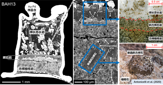 图3. 含水熔体-橄榄岩反应结晶实验结果(左)与壳幔边界(右)的苏长辉长岩-斜方辉石岩-角闪橄榄岩序列