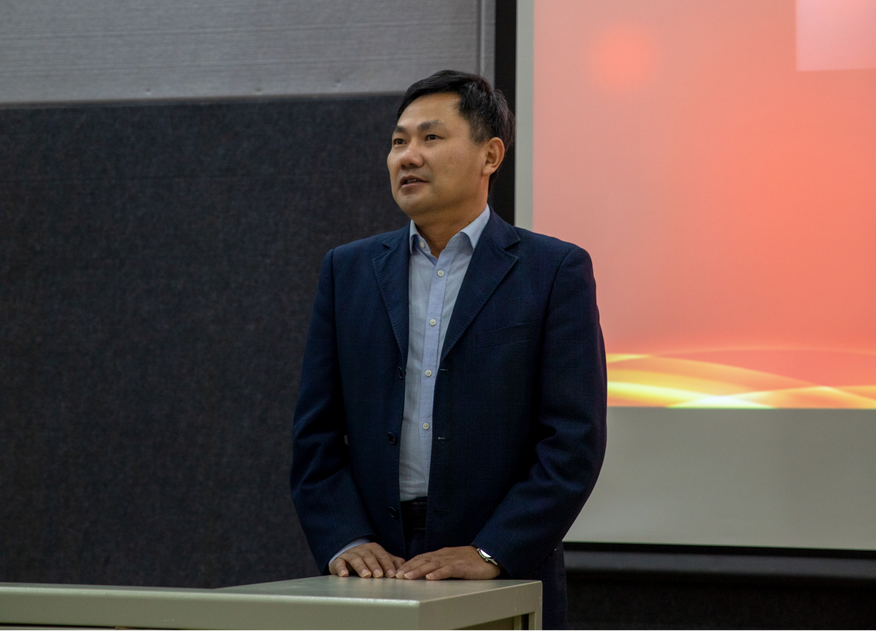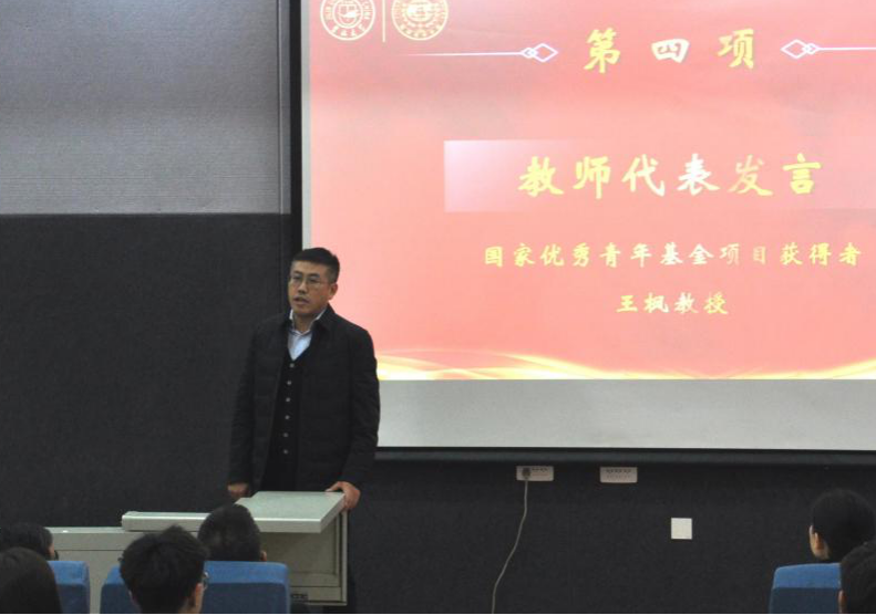 教师代表,国家优秀青年科学基金项目获得者王枫教授发言。他首先代表公司全体教师欢迎各位新同学的到来。王枫从自己读研期间的感受出发,以“新鲜”、“焦躁”、“兴奋”三个关键词入手勉励同学们要惜时、自强、博学,充分利用在校学习的黄金阶段,既要脚踏实地学习,也要不忘仰望星空,保持对未来科学领域的热情与执著。