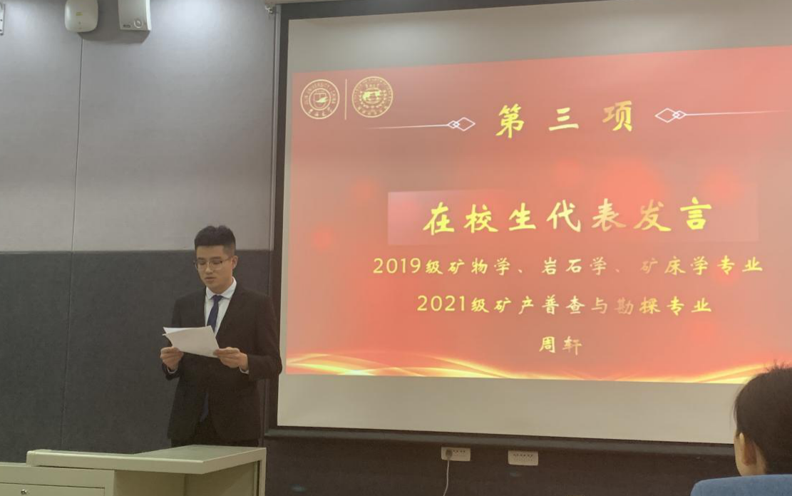 典礼上,2021级地质学专业张智超和2021级矿产普查与勘探专业直博生周轩分别代表新生和在校生进行发言。希望同学们能潜心科研,知行合一,赓续地质基因,传承吉大精神。