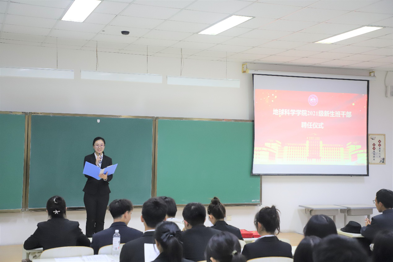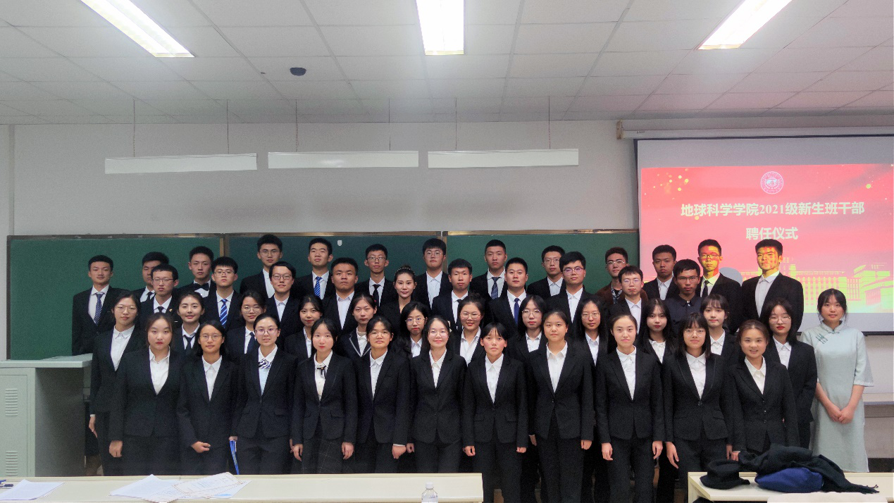 2021年10月31日晚,2021级本科新生班干部聘任仪式在李四光楼310教室顺利举行,参加仪式的有团委书记兼2021级辅导员韩旭老师、2020级辅导员助理以及2021级新任班干部。本次会议由姚欣欣同学主持。