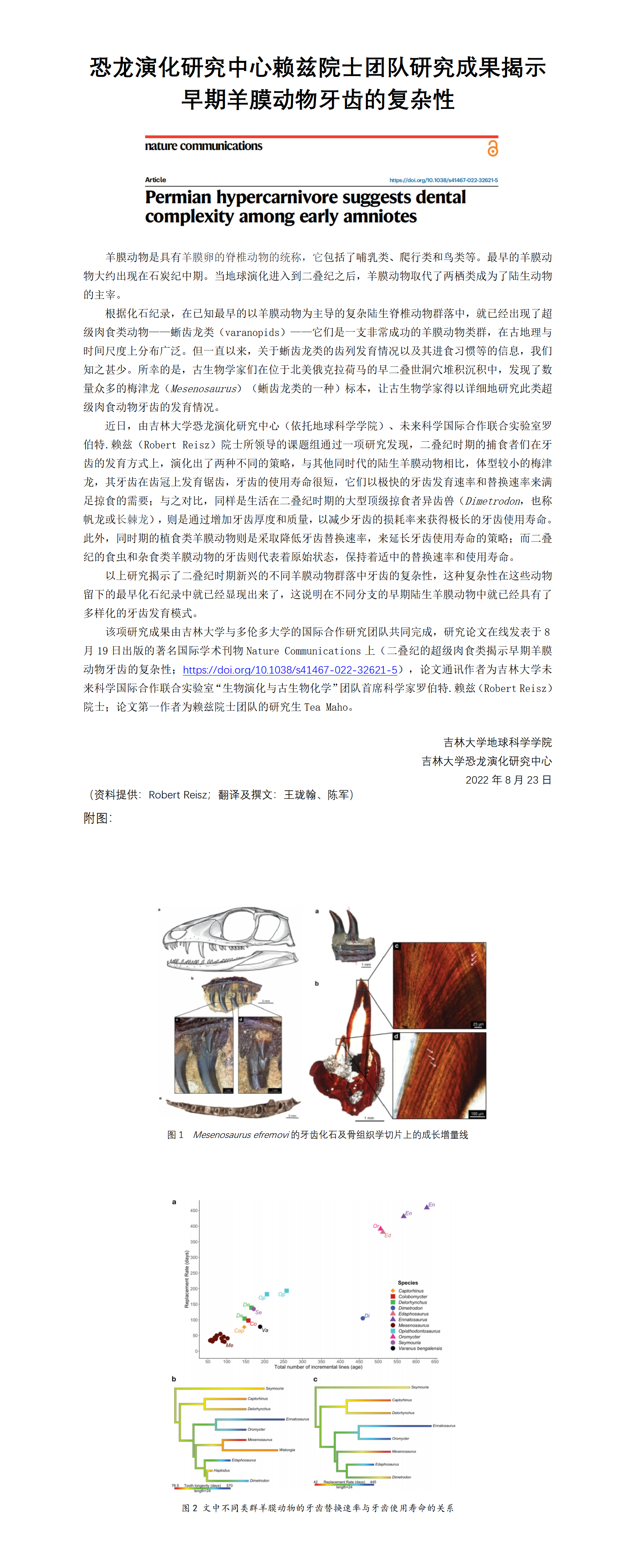 恐龙演化研究中心赖兹院士团队研究成果揭示早期羊膜动物牙齿的复杂性