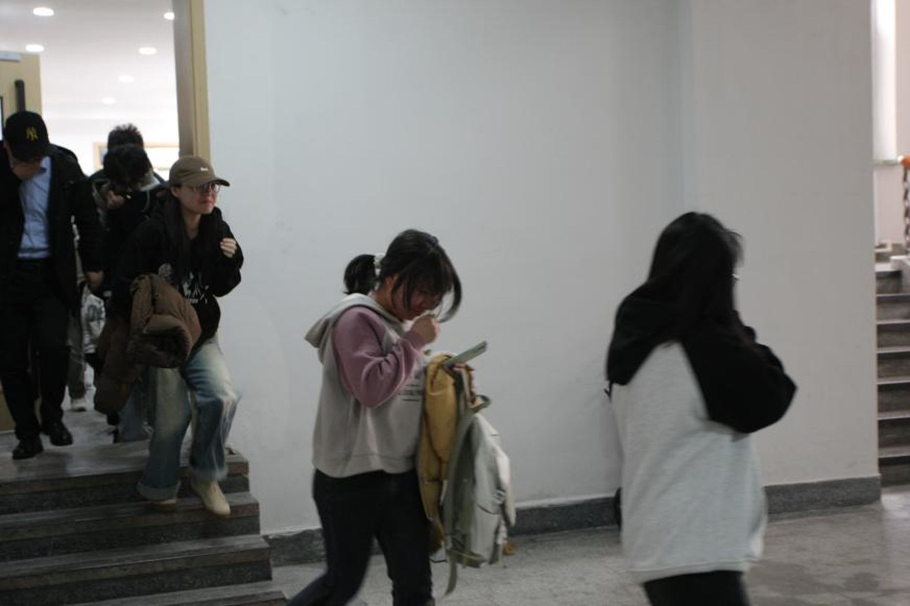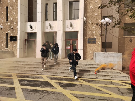 讲座结束后,在场师生按照保卫处的指令进行了疏散演练。随着总指挥一声令下,急促的消防警笛鸣起,通讯组、疏散抢救组、灭火组迅速进入各自战位,断电、控制火情。师生代表在楼层疏散引导员的指挥下,低伏姿势捂住口鼻,沿着指定的疏散路线快速、有序地向鸽子楼排球场撤离。100秒内,师生全部有序撤离至安全地带。5分钟后明火被扑灭,总指挥清点人数确认全体师生安全后,演练结束。