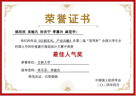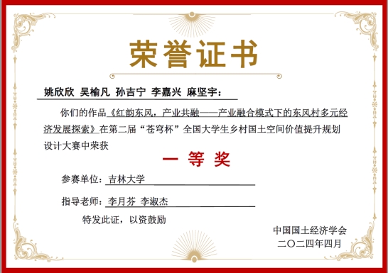 由中国国土经济学会、“科创中国”乡村振兴联合体、中国高等教育学会资源能源教育分会主办,中国地质大学(北京)承办的第二届“苍穹杯”全国老员工乡村国土空间价值提升规划设计大赛总决赛于2024年4月19日-21日在中国地质大学(北京)举行。公司伟德体育伟德体育官方网站由李月芬和李淑杰老师指导,本科生姚欣欣(组长)、吴榆凡、孙吉宁、李嘉兴和麻坚宇五位同学组成的伟德体育伟德体育官方网站代表队参赛作品《红韵东风,产业共融——产业融合模式下的东风村多元经济发展探索》荣获一等奖,单项奖最佳汇报奖和最佳人气奖。