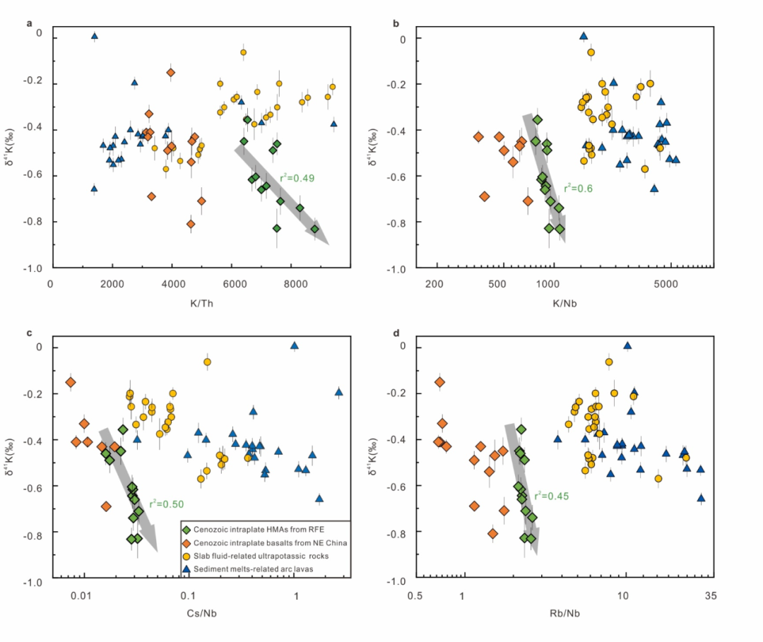 图2 俄罗斯远东新生代高镁安山岩(a)K同位素vs K2O图解;(b)K同位素vs Ce/Pb图解;(c)K同位素vs La/Sm图解;(d)K同位素vs Nb/La图解