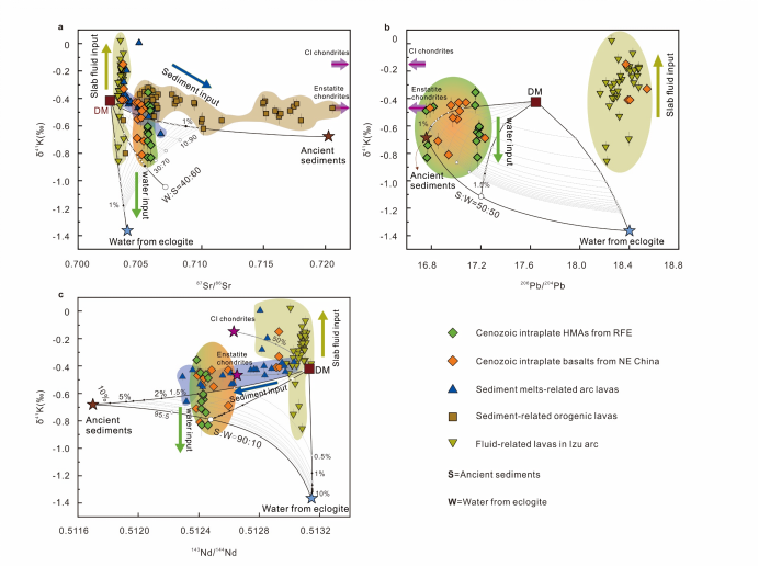 1. 首次利用K同位素示踪深部水循环过程。K在俯冲以及在地幔过渡带中与水的行为具有高度一致性,且不受去气作用的影响。在地幔部分熔融过程中,K几乎全部进入熔体,且俯冲板片中的K可以通过一系列含K矿物到达地幔过渡带的深度。另外,地表物质与地幔在K同位素组成上存在显著差异,因此,K同位素是示踪深部水循环的理想工具。