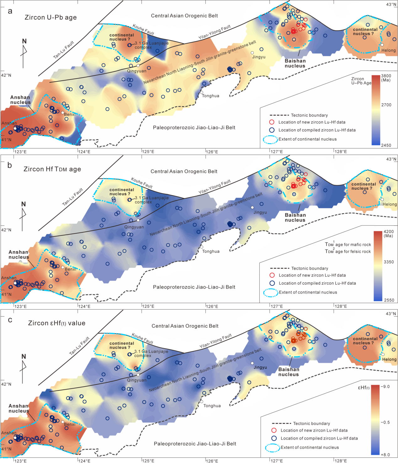 2. 揭示出华北克拉通鞍山-吉南地区地壳结构分布特征及各古陆核亲缘性:在太古宙基底的锆石U–Pb年龄、锆石εHf(t)值和锆石模式年龄等值线图中,古老陆核呈孤岛状被新太古代花岗绿岩带围绕的地壳结构特征(图3),区别于与板块俯冲相关的岛弧带的线性展布特征。华北克拉通鞍山、冀东及白山湖古陆核具有亲缘性,它们经历了相似的始–中太古代岩浆活动。锆石Hf同位素还指示三个古陆核的古老锆石具有相似的TDM2模式年龄(4.2–3.8 Ga)和176Lu/177Hf比值(0.022)(图2e)。