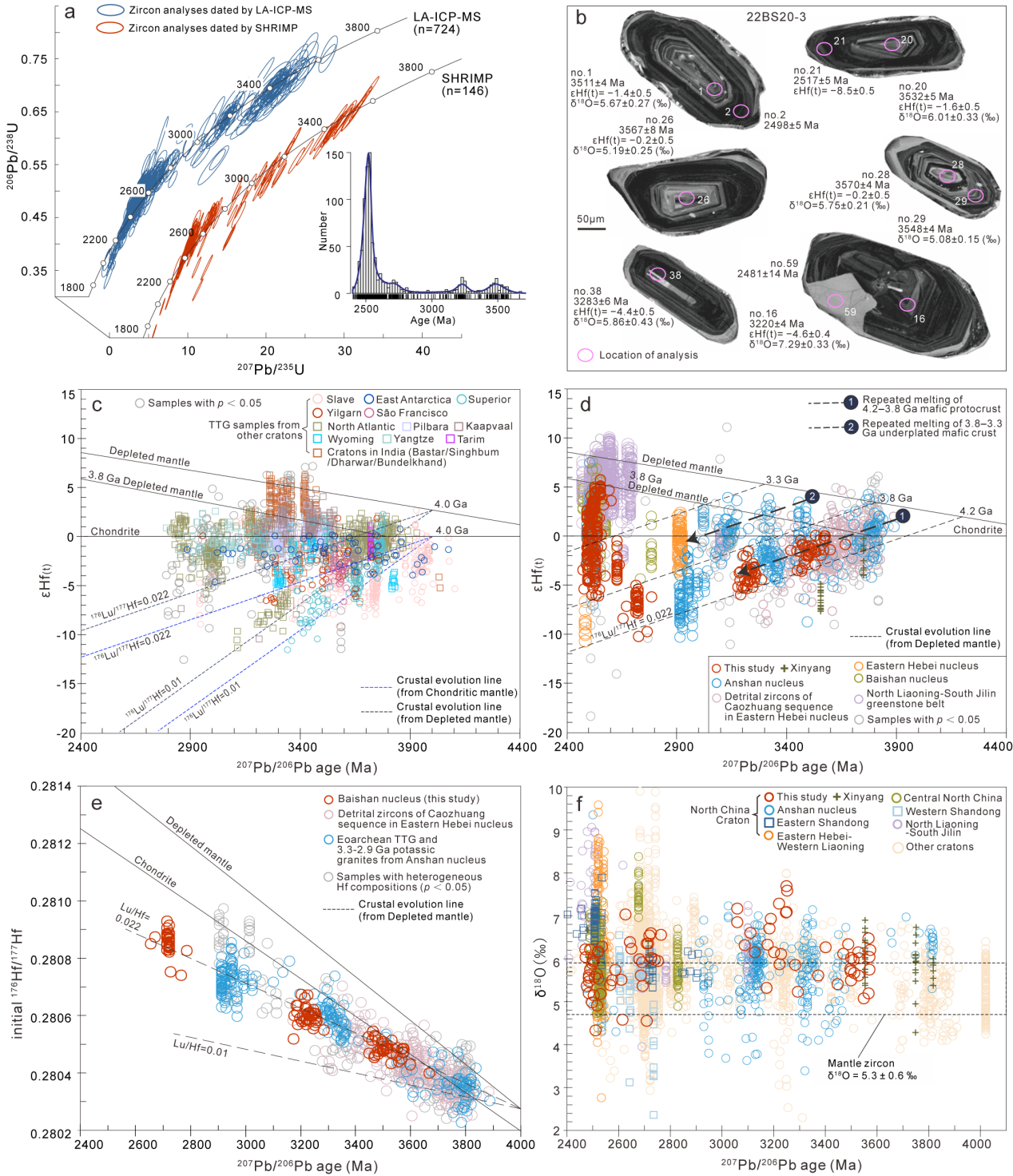 图2 锆石U–Pb定年和Hf–O同位素组成;(a)白山湖古陆核古–新太古代花岗质岩石的锆石U–Pb谐和图;(b)~3.3 Ga二长花岗岩样品22BS20-3中典型锆石的CL图像;(c)其它主要克拉通始–中太古代TTG岩石的锆石εHf(t)值统计图;(d)华北克拉通太古宙岩石的锆石εHf(t)值统计图;(e)鞍山、冀东和白山湖古陆核古老锆石的初始176Hf/177Hf值统计图;(f)全球太古宙锆石δ18O值统计图
