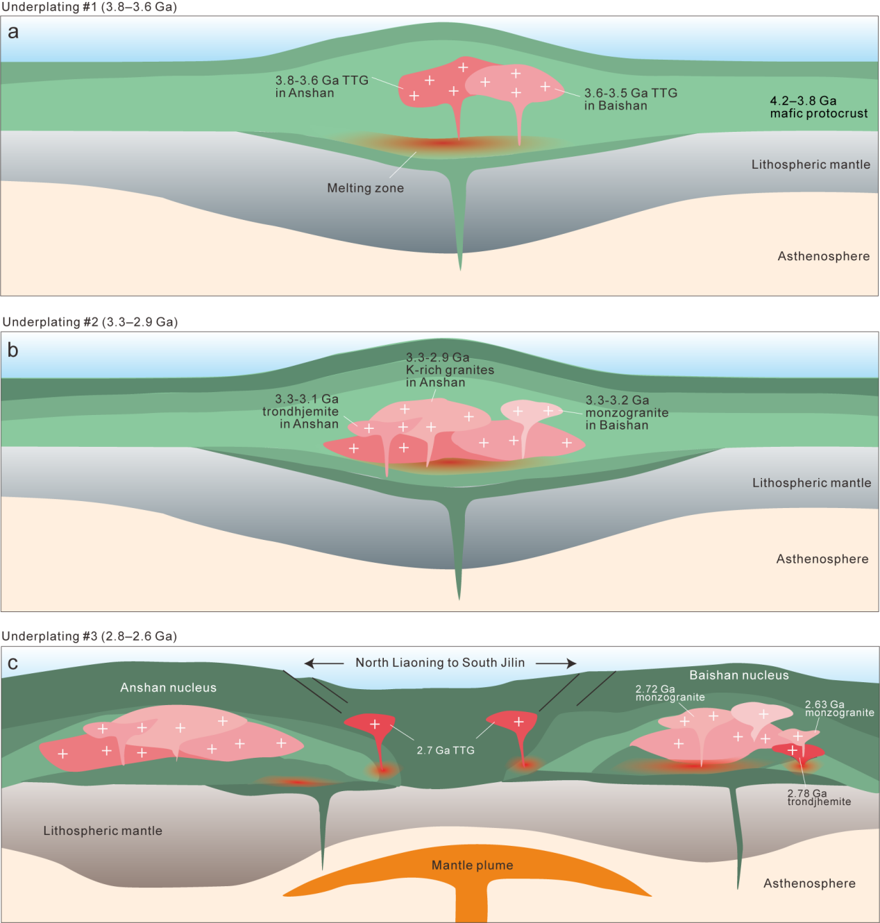 3. 提出地幔柱体制下多期次岩浆底辟事件导致华北克拉通古老陆核的生长与成熟化过程:(1)4.2–3.8 Ga基性原始地壳在3.8 Ga和3.6 Ga时发生部分熔融形成初始的鞍山–白山湖古陆核(图4a);(2)古–中太古代期间多次的基性岩浆底辟事件导致鞍山–白山湖古陆核的始–古太古代陆壳发生再造,形成具有一定规模的3.3–2.9 Ga富钾花岗岩(图4b);(3)新太古代早期的岩浆底辟事件导致白山湖古陆核中2.72 Ga和2.63 Ga二长花岗岩的形成,并可能使得鞍山与白山湖古陆核的分离(图4c)。新建立起的年代学格架与全球太古宙克拉通(例如,Eastern Pilbara、Yilgarn和Kaapvaal克拉通)具有明显相似性,均记录了地幔柱体制下多期次岩浆底辟作用主导古老克拉通的生长和成熟化的地质过程。