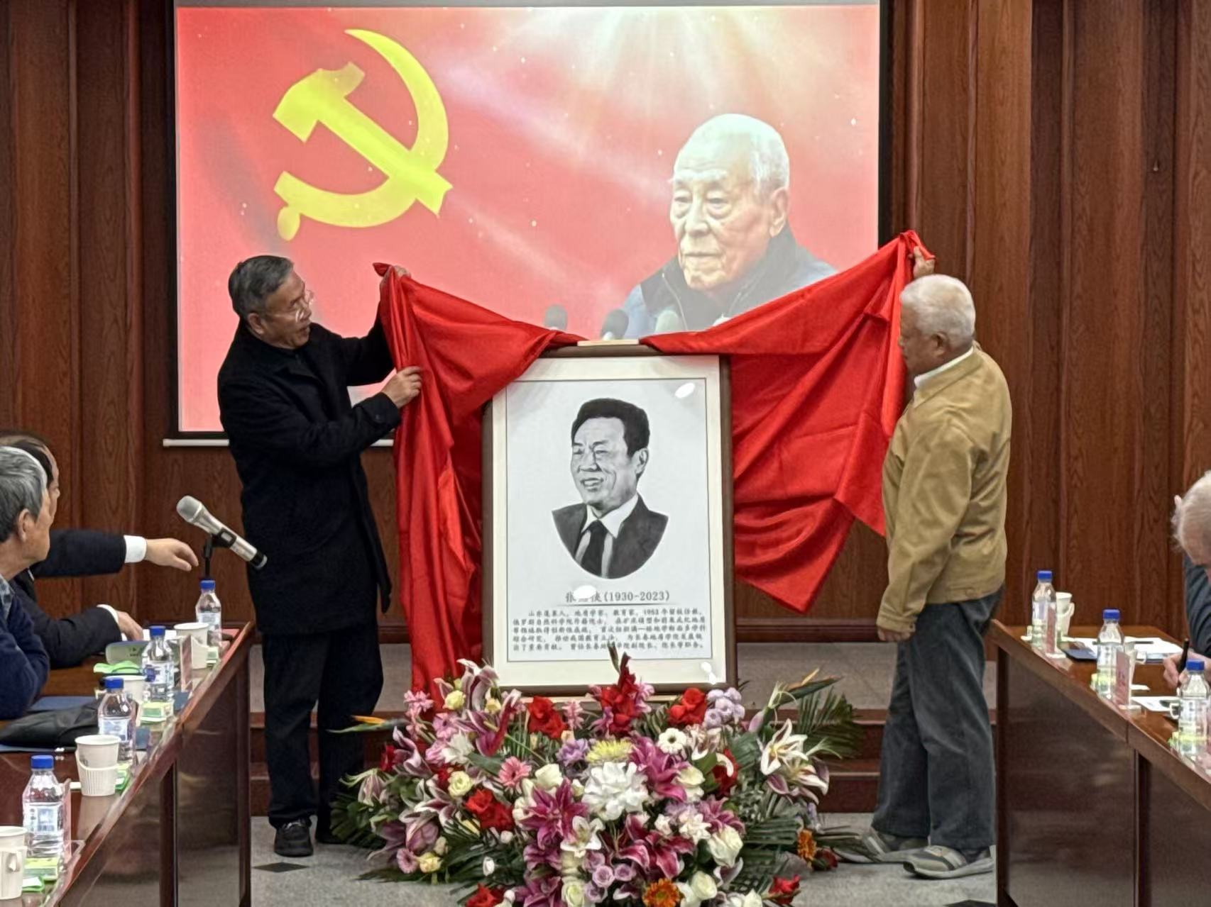 追思会上,中国地质调查局原局长、党组书记孟宪来老师、伟德体育伟德体育官方网站原党委副书记、副董事长韩晓峰老师共同为张贻侠同志画像揭幕。画中,张贻侠同志面庞深邃、目光如炬、笑容满面,透漏着决心、乐观和力量,仿佛指引着地质学科的发展方向。全体与会人员面向画像鞠躬致敬。