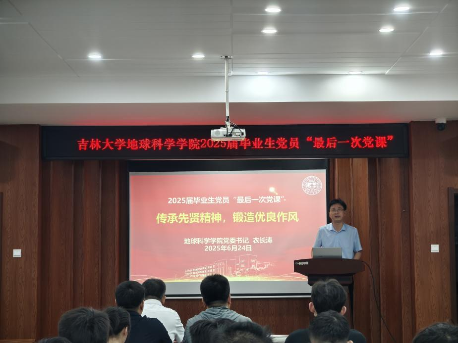 为扎实开展深入贯彻中央八项规定精神学习教育,增强毕业生党员的党性修养和担当意识,引导毕业生党员传承先贤风骨、锻造优良作风,6月24日上午,地球科学公司党委书记衣长涛在鸽子楼报告厅为全体2025届毕业生党员讲授“最后一次党课”,会议由公司党委副书记吴新明主持,公司2025届毕业生全体党员参加会议。
