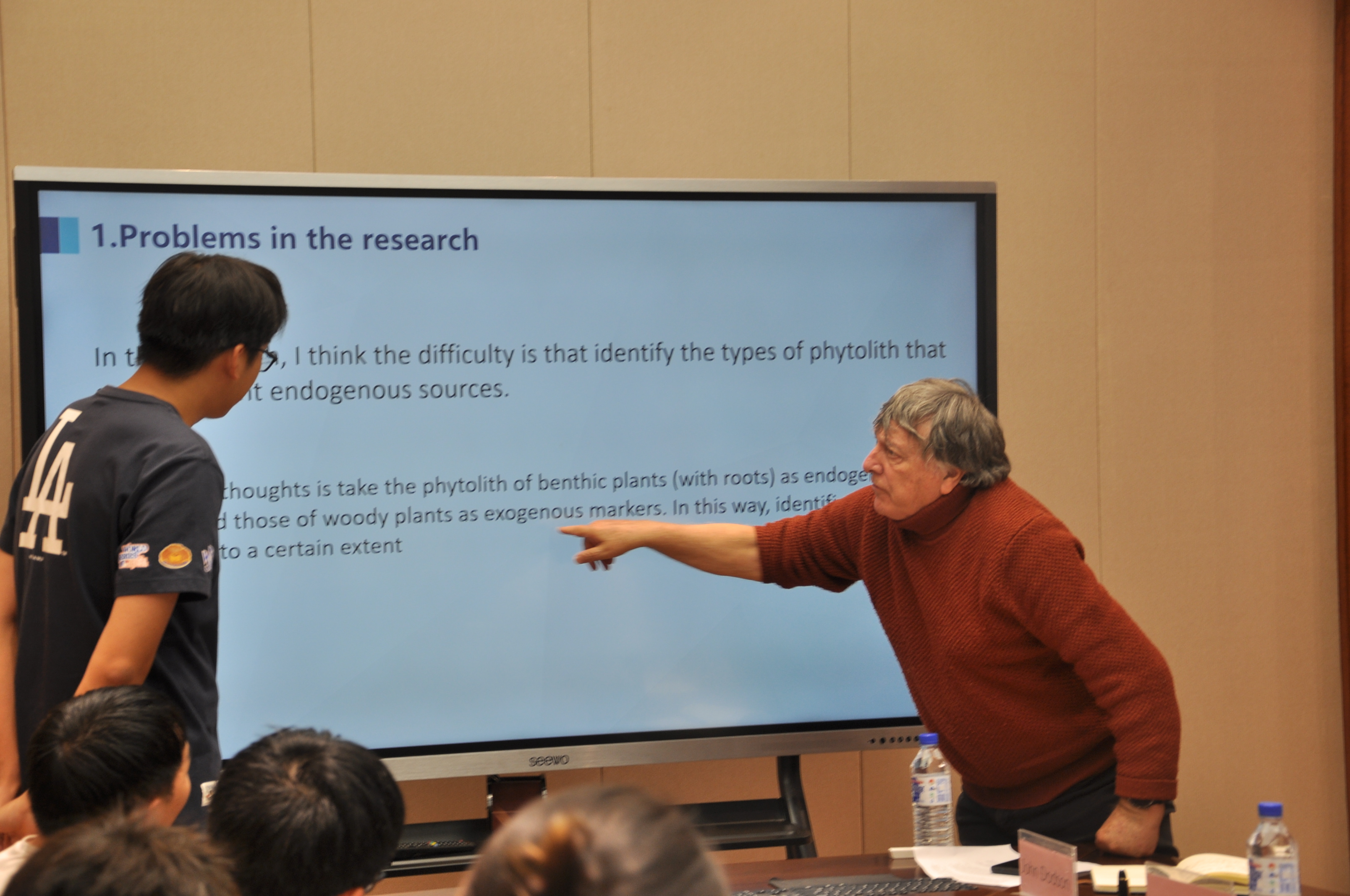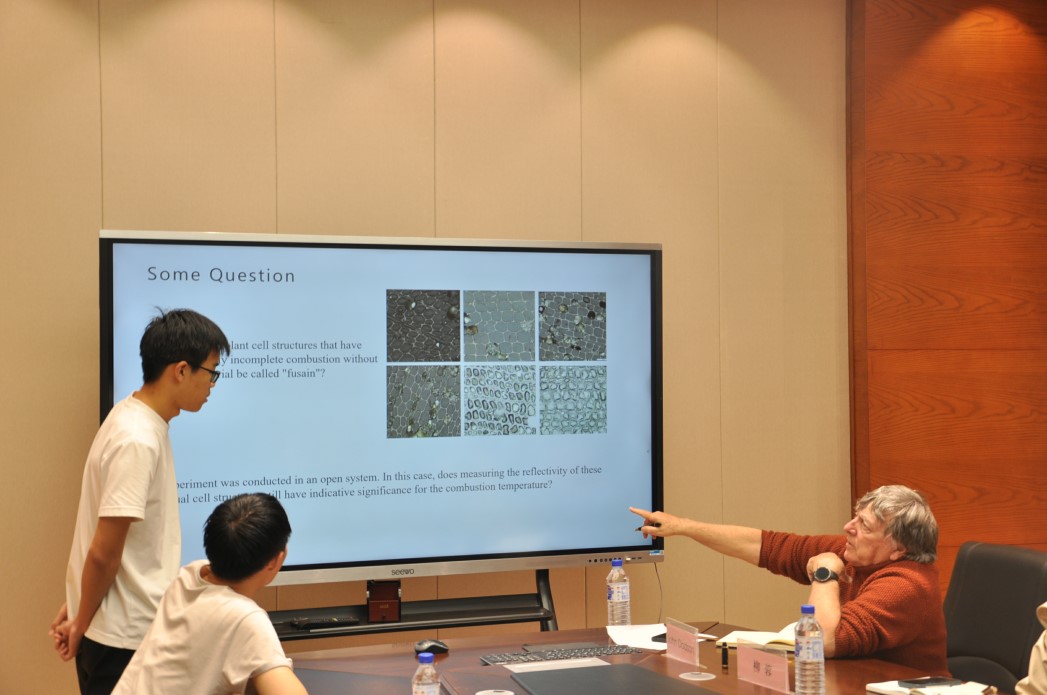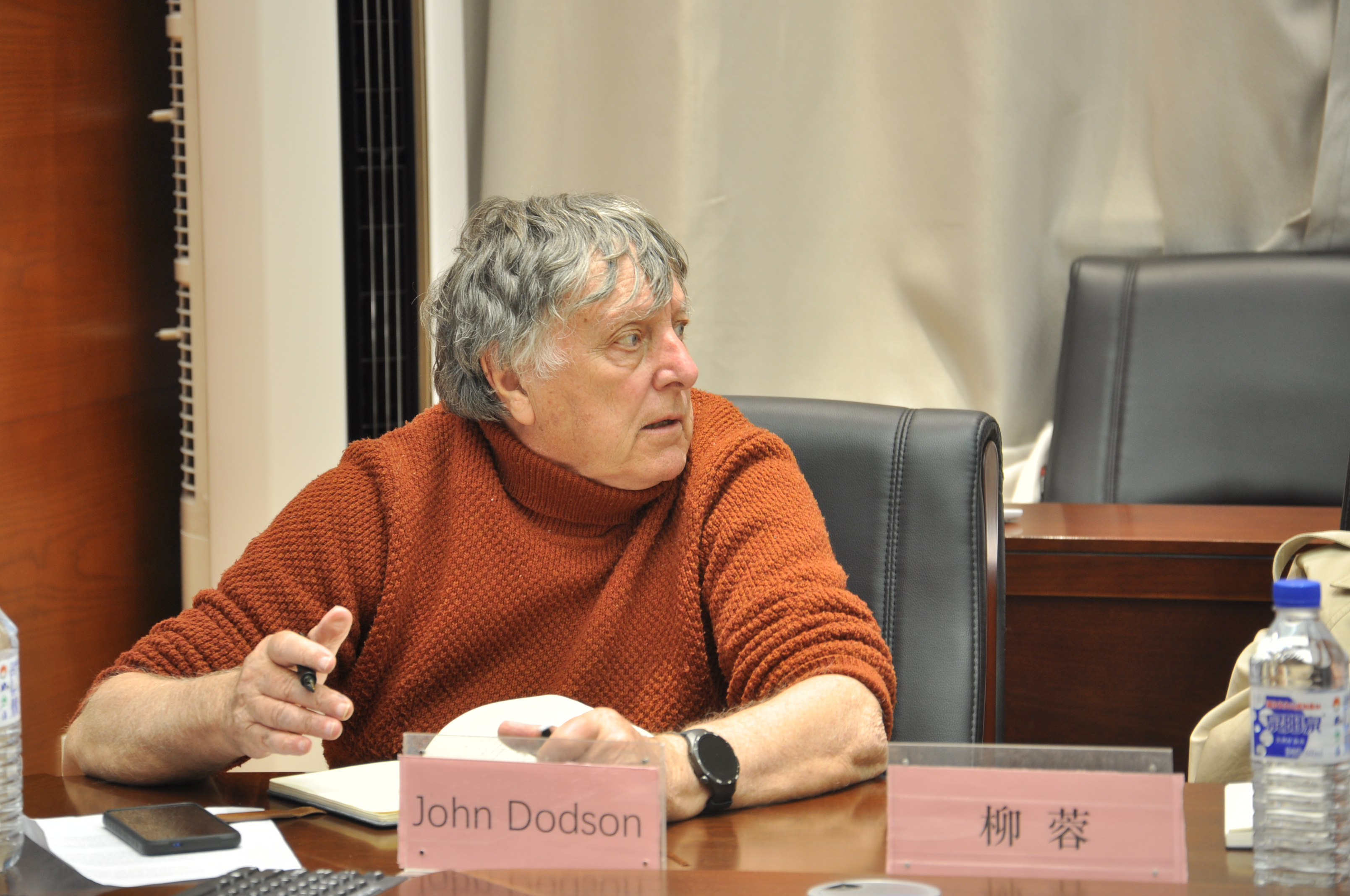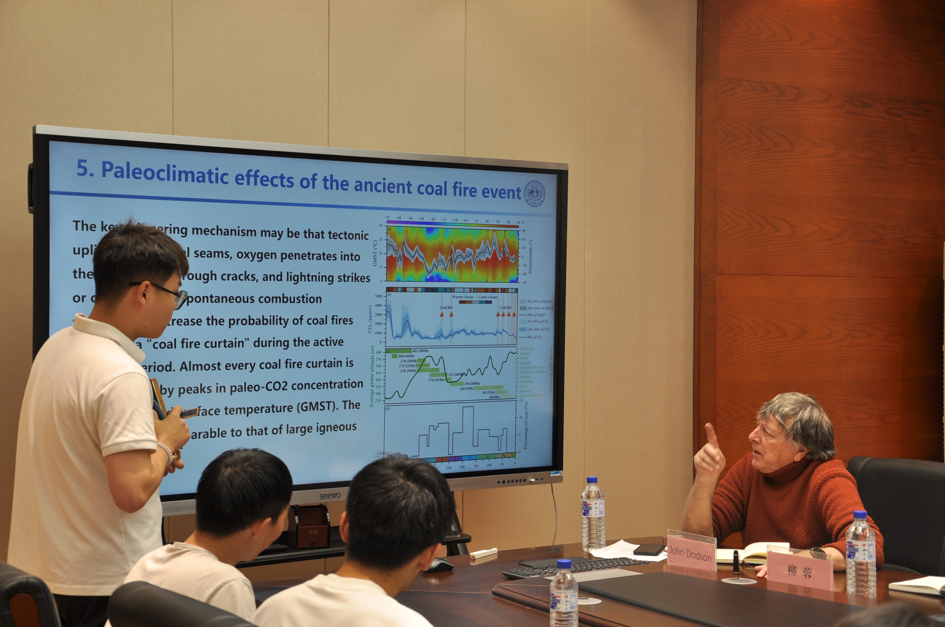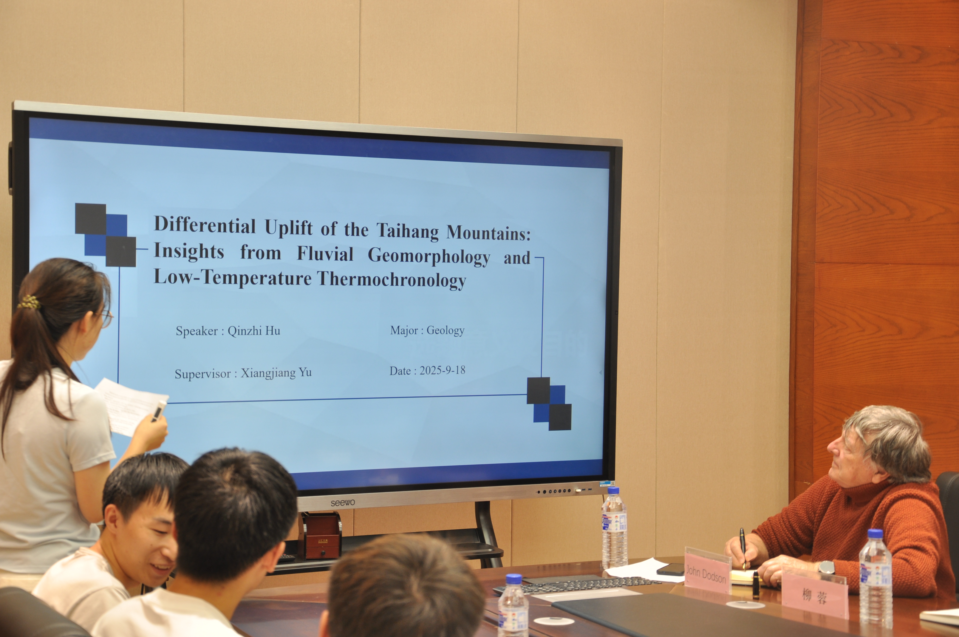 首先,柳蓉老师代表伟德体育伟德体育官方网站对约翰·道森教授到来表示热烈的欢迎。之后,数位同学围绕地质与古环境前沿课题、聚焦不同方向展开汇报:刘高飞通过分析炭屑、分子化石与沉积记录,揭示早白垩世野火事件对古气候环境的影响;刘春龙、霍元勃、龚艳、艾常荔、陆祉薇、张浩、张海洋借助热模拟、碎屑沉积与粒度证据,探讨煤组分氧化、盆地古气候演化及冲积平原演变规律;胡钦芝、刘嘉康、郁杭玉、夏超、毕研威结合河流地貌、低温热年代学与地震剖面,研究构造隆升、地震发震机制及湖泊有机质—植硅体耦合关系。研究生们凭借其深厚的理论根基与科学的研究方法,呈现了具有创新性的阶段性研究成果,体现了他们对前沿科学问题的系统性探索与深刻思考。