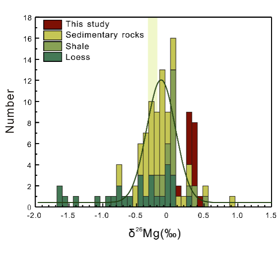 (1) 与典型的上地壳物质(如黄土、页岩和其他沉积岩等)相比,大多数样品具有更高的Mg同位素组成(图3),反映了该时期强烈的化学风化作用。