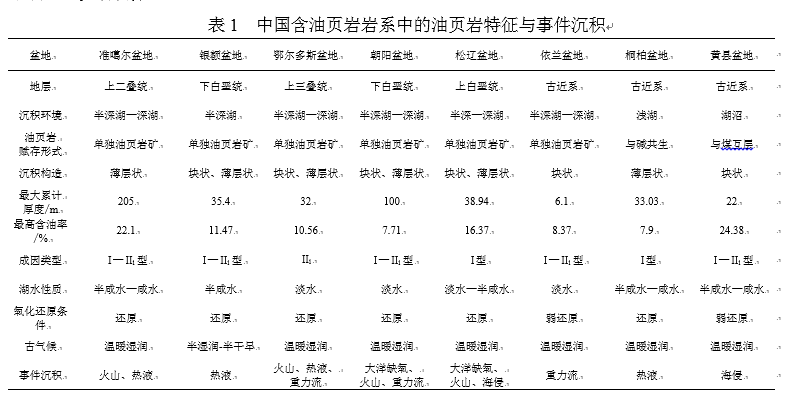 通过对全国50个盆地、95个含矿区油页岩成因和分布规律的总结和归纳,揭示出火山、热液、大洋缺氧、气候突变、海侵、重力流等事件不同程度地改变古湖泊水体条件,引发湖泊表层高生产力,促进藻类勃发和微生物繁盛,并形成稳定的湖泊分层环境,成为油页岩富集的有利因素(表1)。但若过量的火山灰、频繁火山爆发释放大量气体、高温高压的间歇性热液流体以及频繁的重力流作用将不利于油页岩富集。