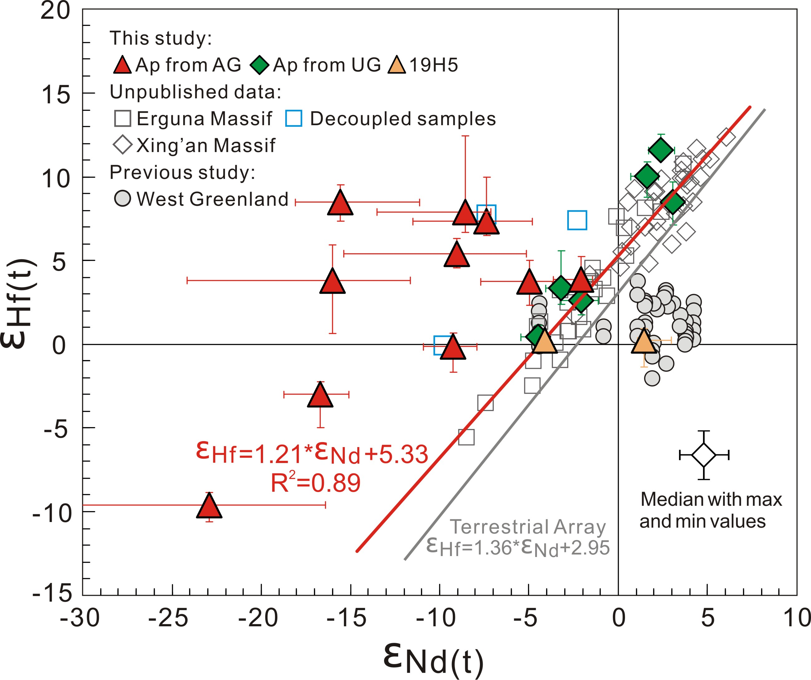 (1)经历晚期构造热事件改造的花岗岩中的磷灰石普遍具有不规则的次生加大边、复杂的内部结构和较低的LREE含量(图2a;图3a,b),可能是受到两方面因素共同控制:①磷灰石重结晶过程中伴随着其它富LREE矿物(如绿帘石)的形成;②磷灰石中的LREE易在交代淋滤过程中被流体迁移。此外,这些变质/交代成因的磷灰石普遍具有变化很大的Sm-Nd同位素组成(图2b),其εNd(t)值与锆石εHf(t)值解耦(图4中红色三角形),这是由于交代淋滤过程中Nd相比于Sm更容易进入到流体中,导致磷灰石的147Sm/144Nd比值升高,使其εNd(t)值出现明显偏差。