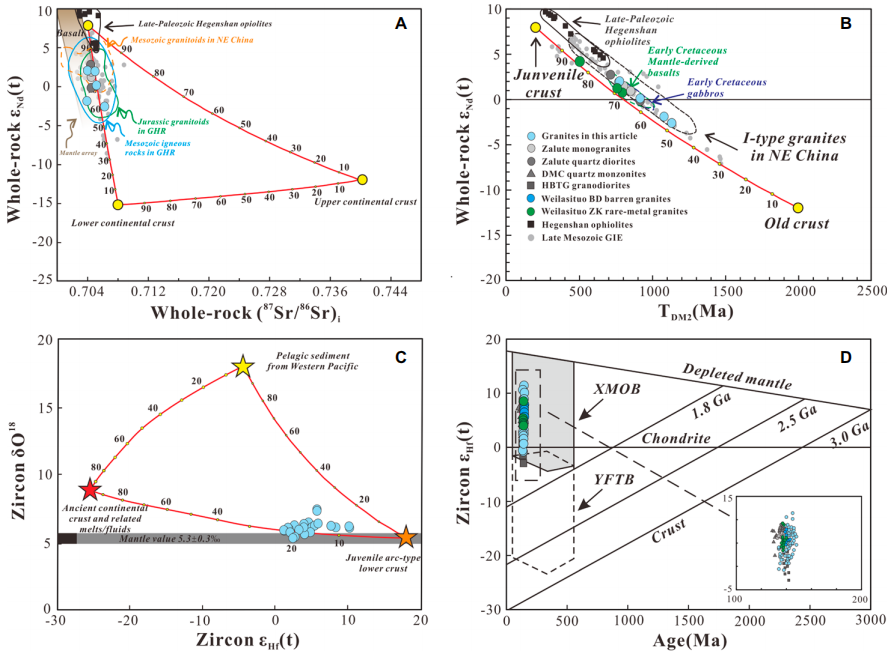 1. 确定了高分异花岗岩的源区组成。高分异花岗岩属于高分异I型花岗岩,主要造岩矿物和副矿物共同的分离结晶在其形成过程中起到了至关重要的作用。锆石O-Hf和全岩Sr-Nd-Hf同位素组成指示早白垩世高分异花岗岩起源于年轻弧型下地壳与古老陆壳基底的重熔,并可能存在再循环远洋沉积物的贡献(图2)。