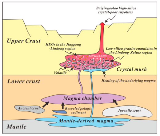 2. 建立了穿地壳晶粥模型。研究区高分异花岗岩与林东-扎鲁特地区低硅花岗岩具有相近的成岩年龄与同位素组成,暗示它们密切的成因联系。而高分异花岗岩具有较低的Eu/Eu*比值和Sr含量,具有明显的抽提熔体趋势。此外,瑞利分馏模拟结果显示预测的抽提熔体和堆晶分别与研究区高分异花岗岩和林东-扎鲁特低硅花岗岩完美契合(图3)。结合东北地区早白垩世的地球动力学背景,认为在早白垩世时期幔源岩浆的底垫作用和气体压滤作用共同促进了地壳浅部晶粥储库的再活化,并促使了高硅熔体的抽提,从而产生了大兴安岭南段较大规模的早白垩世高分异花岗岩(图4)。