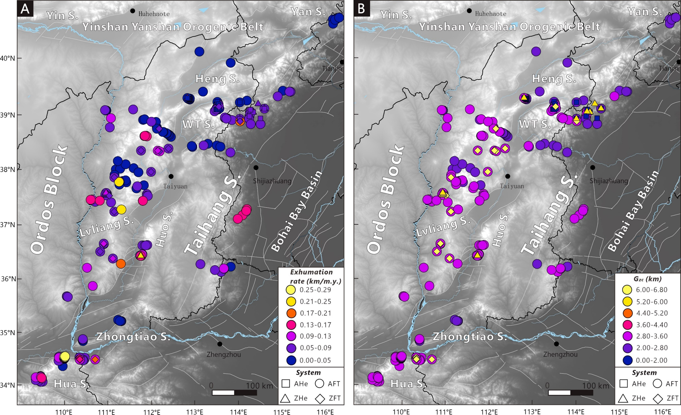 图2 (A)山西裂谷系侧翼低温热年代学数据集的稳态剥露速率;(B)低温热年代学数据集的闭合深度