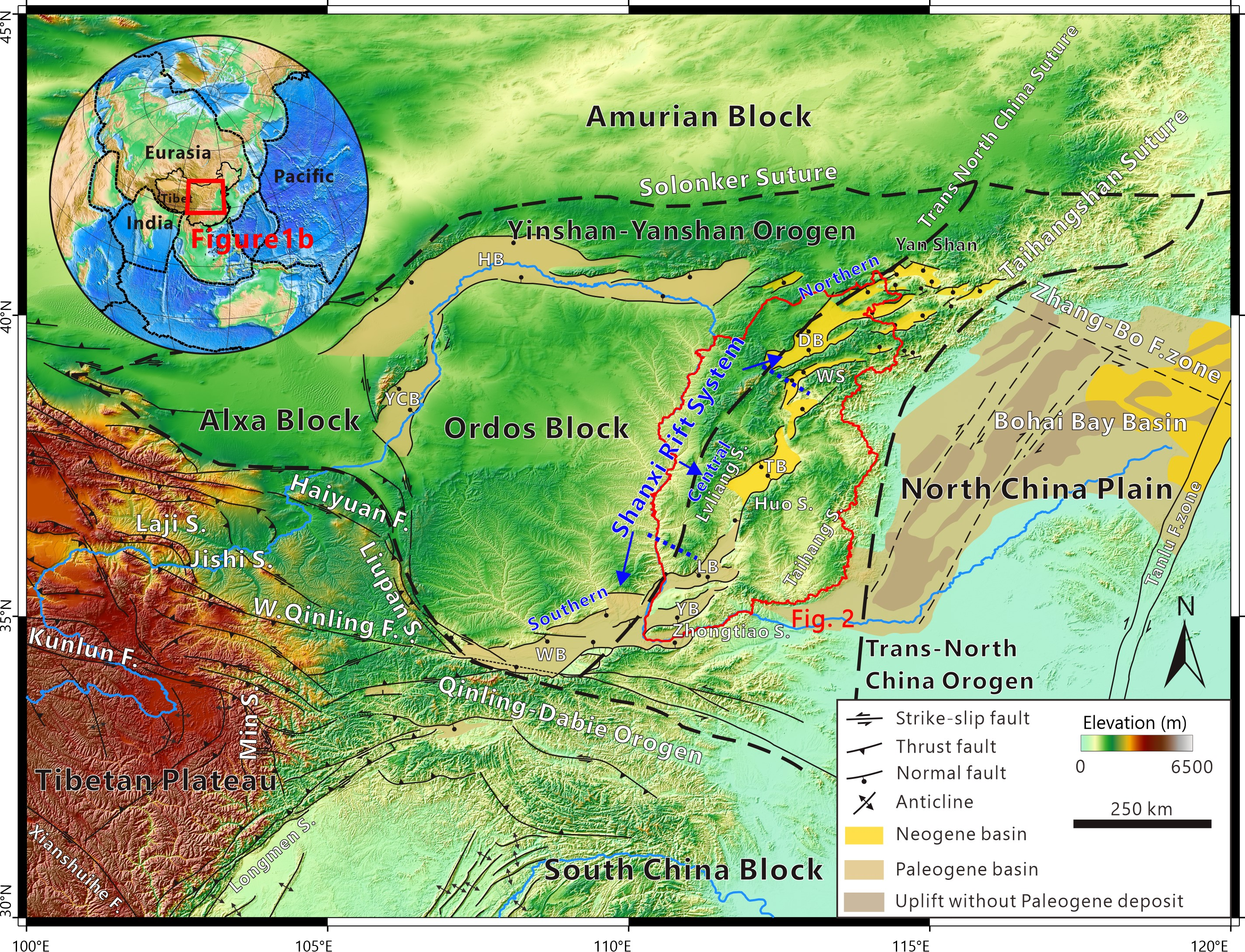板内裂谷的形成和演化为我们理解板块内部动力学和地壳演化提供了关键视角,涉及板内伸展应力、地壳热结构变化和岩石圈挠曲等复杂因素。位于华北克拉通内的山西裂谷系是亚洲最大的裂谷之一(图1),其形成机制和演化历史仍存争议,为研究上述科学问题提供了重要素材。