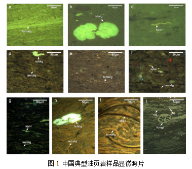 中国油页岩有机碳含量较高,介于7.5%~38%,有机质大多处于未熟~低熟热演化阶段。陆相油页岩有机显微组分以反映高湖泊生产力的层状藻和结构藻为主(图1)。从有机成因类型上,油页岩分为腐泥型、腐殖腐泥型和腐泥腐殖型油页岩。工业油页岩具有中-高含油率和高灰分特点。