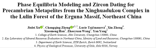 以上研究成果在线发表在地学SCI期刊Journal of Earth ScienceXu, J.L., Zheng, C.Q., Tajčmanová, L., et al., 2018. Phase Equilibria Modeling and Zircon Dating for Precambrian Metapelites from the Xinghuadukou Complex in the Lulin Forest of the Erguna Massif, Northeast China. Journal of Earth Science, 2018, 1-15. DOI:10.1007/s12583-018-0843-z.)。