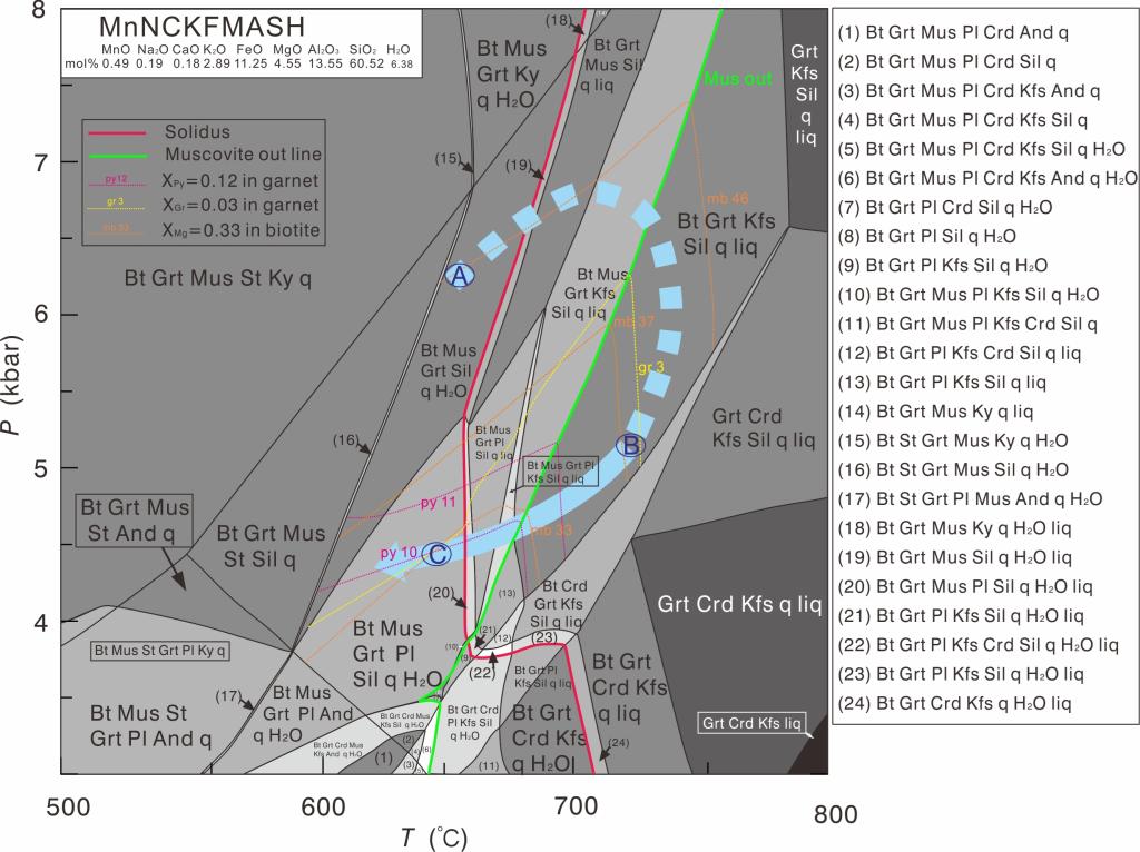 结果表明,绿林林场兴华渡口群变质岩记录了三期变质阶段(图1):进变质阶段(M1),以石榴石核部高Mg#Ti的黑云母包裹体为特征,温压约为650 °C6 kbar;近峰期高角闪岩相变质阶段(M2),以石榴石幔部高Mg#Ti的黑云母包裹体为特征,温压为710-720 °C5-6 kbar;后期退变质阶段(M3),以后生白云母和残留石榴石变斑晶为特征,温压范围约640°C4-5 kbar。其过程表明岩石先后经历饱和水固相线熔融、白云母脱水熔融和部分黑云母脱水熔融,之后由于滞留熔体的存在,在退变质阶段中以近等压降温(IBC)的方式依次发生黑云母脱水熔融、白云母脱水熔融和饱和水固相线熔融反应的逆反应,从而形成一个顺时针的P-T轨迹,变质级别达到高角闪岩相,揭示出俯冲碰撞的构造环境,为限定新林喜桂图缝合带的构造属性提供了新的证据。