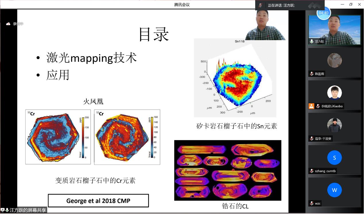 汪老师研究团队所开发的LA-ICP-MS 面扫描技术可应用在多个领域,因此该技术方法受到不同领域研究人员的广泛关注。在报告的提问环节,与会人员提出了该技术在地质学等方面的应用问题,包括数据处理方法、元素如何定量研究、单矿物制靶要求、独居石研究进展等等。另外,汪老师介绍该技术的研究论文“汪方跃, 葛粲, 宁思远, 聂利青, 钟国雄, White NC. 2017. 一个新的矿物面扫描分析方法开发和地质学应用. 岩石学报, 33(11): 3422-3436”也得到了广泛关注和引用,于2021年入选第六届中国科协优秀科技论文。
