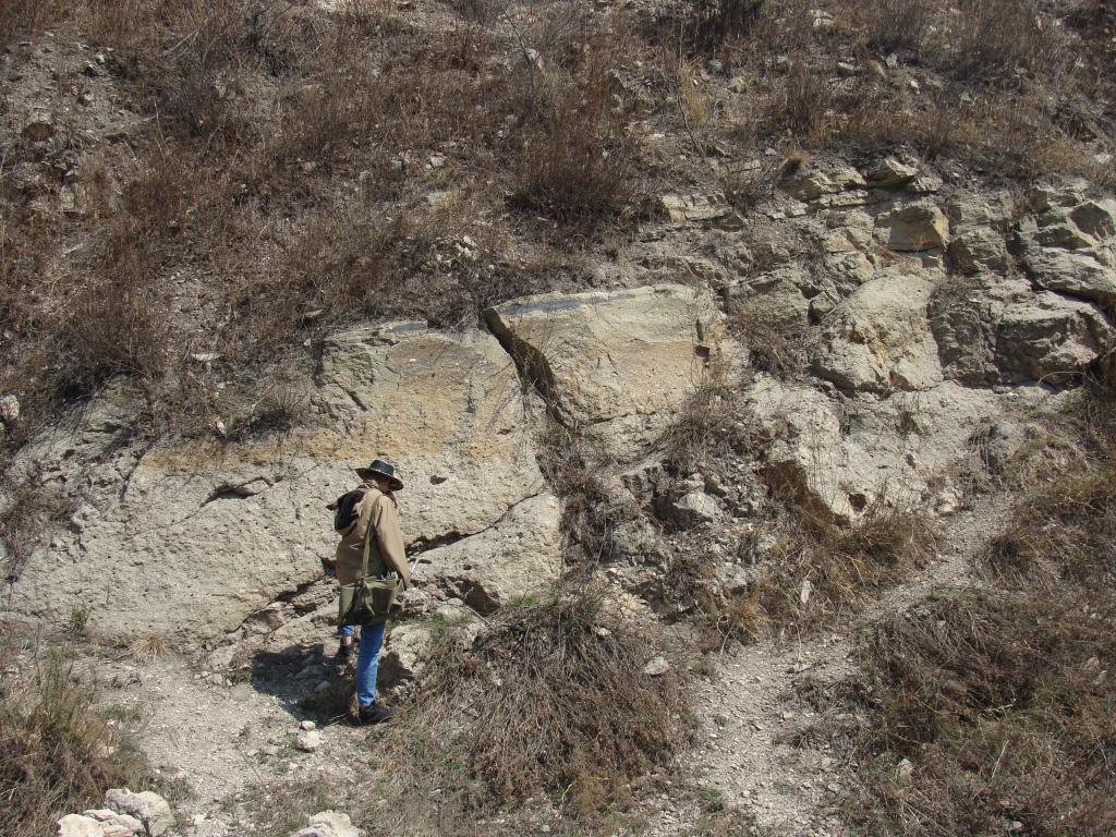 再向前是一个断层破碎带,通过断层面两层的岩石地层的重复和断层面的产状,我们初步判断了断层的性质。