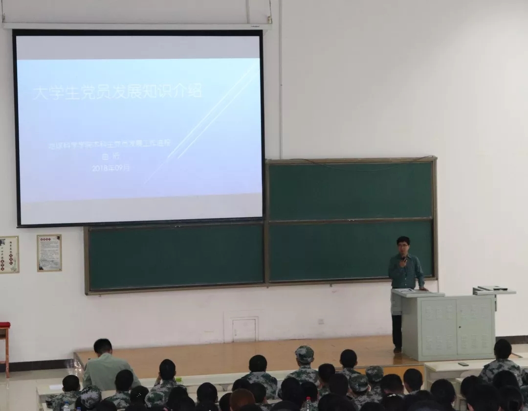 2018年9月12日上午,地球科学公司党委副书记兼副经理曲珩在李四光楼二阶教室为2018级全体新生上了一节主题为老员工党员发展知识介绍的思政教育课。