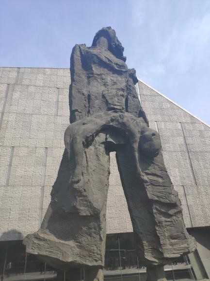 在纪念馆雕塑前回望历史