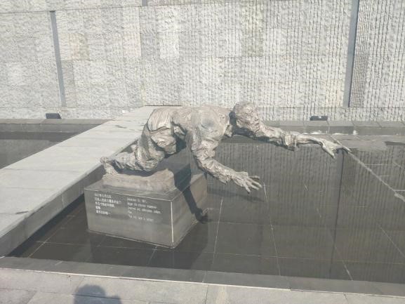纵然现在的祖国繁荣昌盛,我们也不能忘记侵华战争中使得国家人民血流成河的重大历史事件之一的——南京大屠杀。经过商议,社会实践团队于2019年2月19日来到南京大屠杀遇难同胞纪念馆开始了寻访活动。初入纪念馆是一排排以写实派风格反映南京大屠杀时我国手无寸铁的百姓惨状的雕塑。无论是妇孺还是老人,他们的脸上无不写满了悲痛与惊惧。雕塑大师们以巧夺天空的作品仿佛使来到纪念馆的每个人又回到了1937年——那个黑暗与鲜血并存的年代。