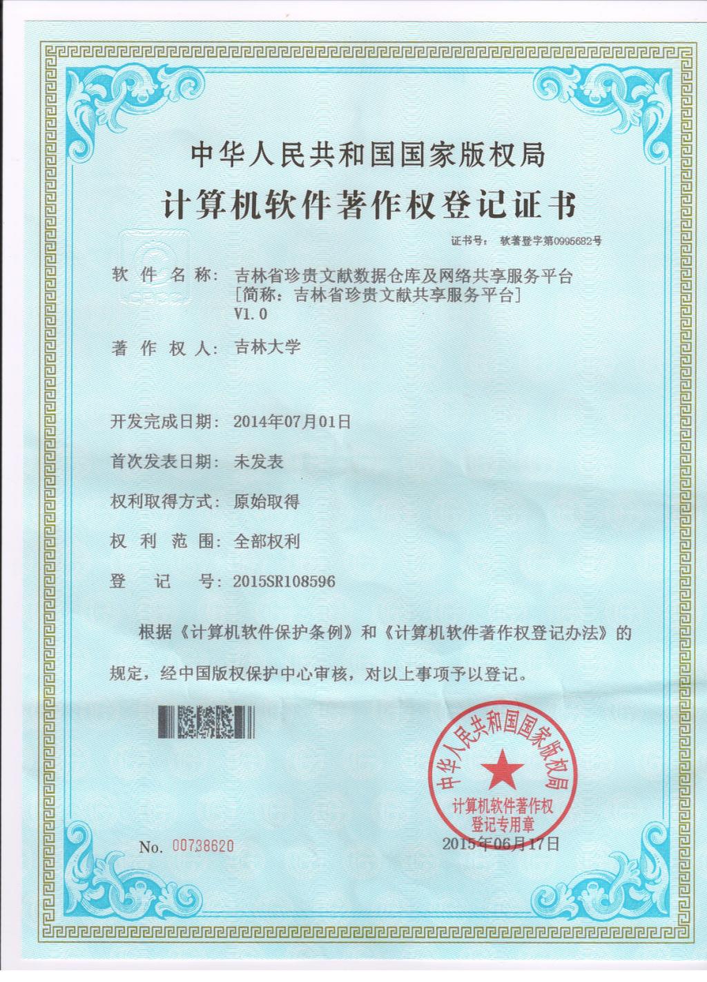 吉林省珍贵文献数据仓库及网络共享服务平台 薛林福等 国家版权局 2015SR108596